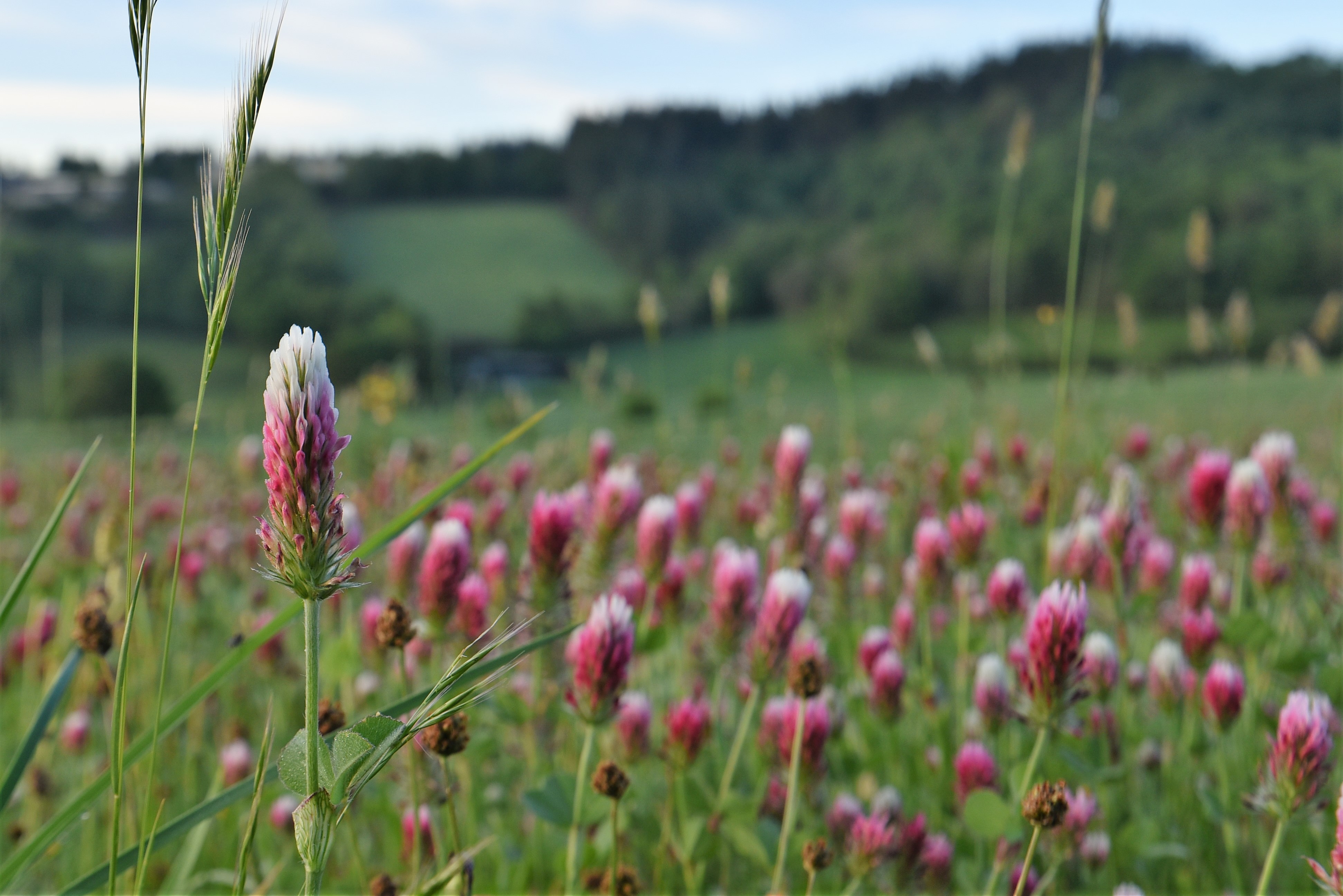 countryside on a dirt track bordered by grassy fields filled with pink clover,